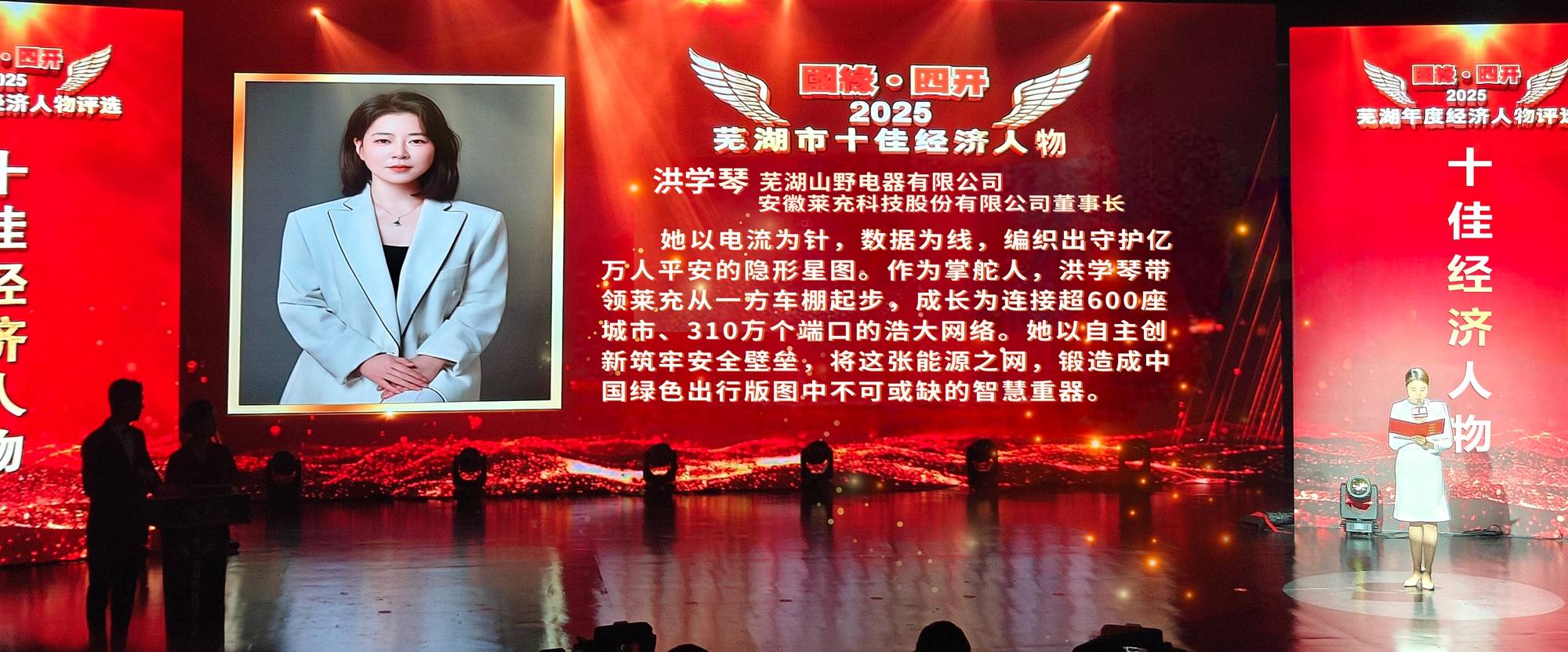 2月6日下午,“国缘四开”2025年芜湖市年度经济人物颁奖典礼在芜湖传媒中心隆重举行。莱充科技董事长洪学琴女士凭借其在绿色能源领域的卓越贡献,荣膺“2025年度芜湖市十佳经济人物”称号。